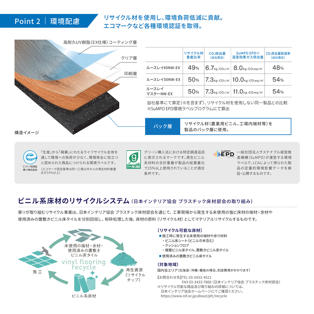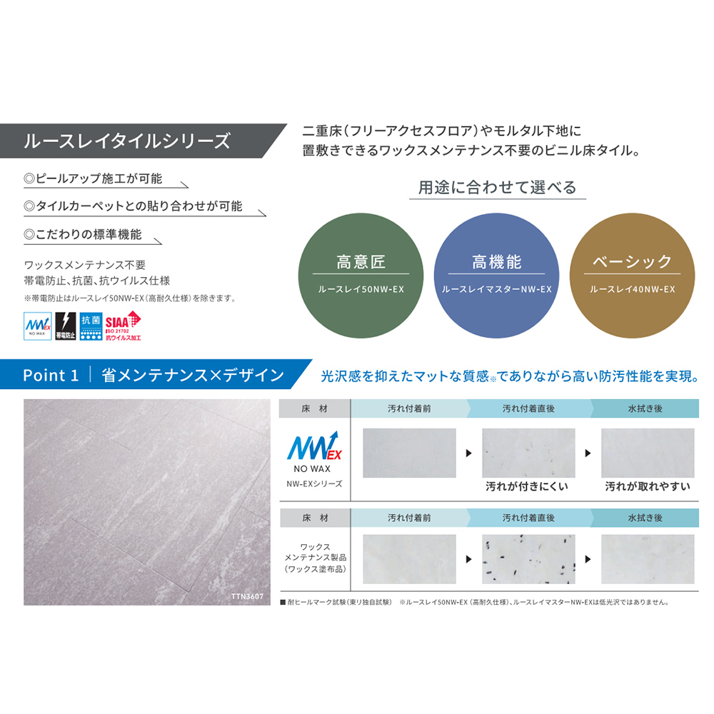 機能・特長 | ●機能:防炎性能試験番号 E2160123、グリーン購入法適合、防炎(NIF)、JIS A 5705 ビニル系床材 床タイル(GB0307004)、抗菌、帯電防止、SIAA(抗ウイルス)、環境配慮型商品(リサイクル、長寿命、省メンテ)、NW-EX(ワックス不要)、LVT、GOOD DESIGN、エコマーク、エコリーフ宣言、Floor Score ・『機能の説明はこちらから』 |