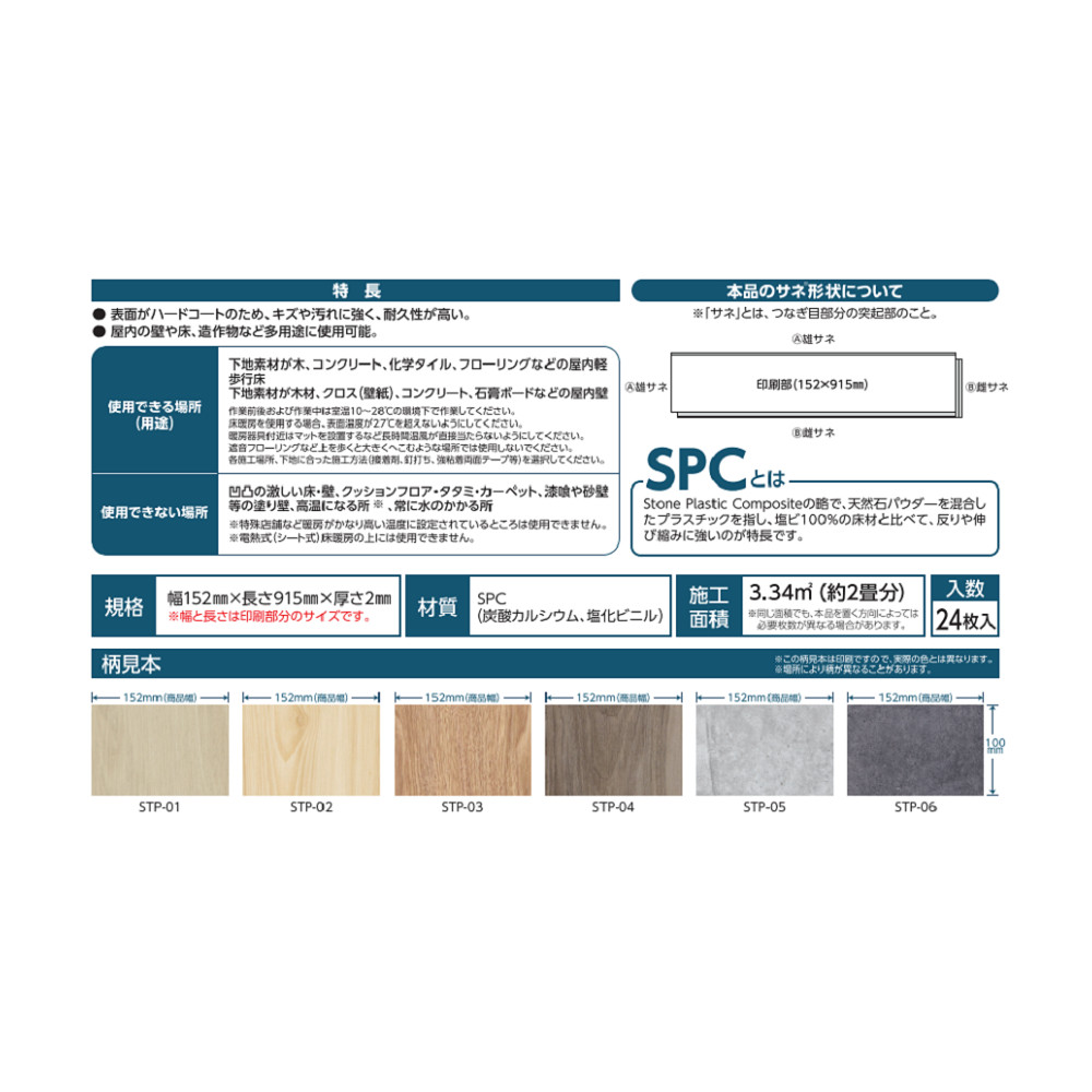 機能・特長 | ●表面がハードコートのため、キズやよごれに強く、耐久性が高い。 ●屋内の壁や床、造作物など多用途に使用可能。 ※SPCとはStone Plastic Compositeの略で、天然石パウダーを混合したプラスチックを指し、塩ビ100%の床材と比べて、反りや伸び縮みに強いのが特長です。 |