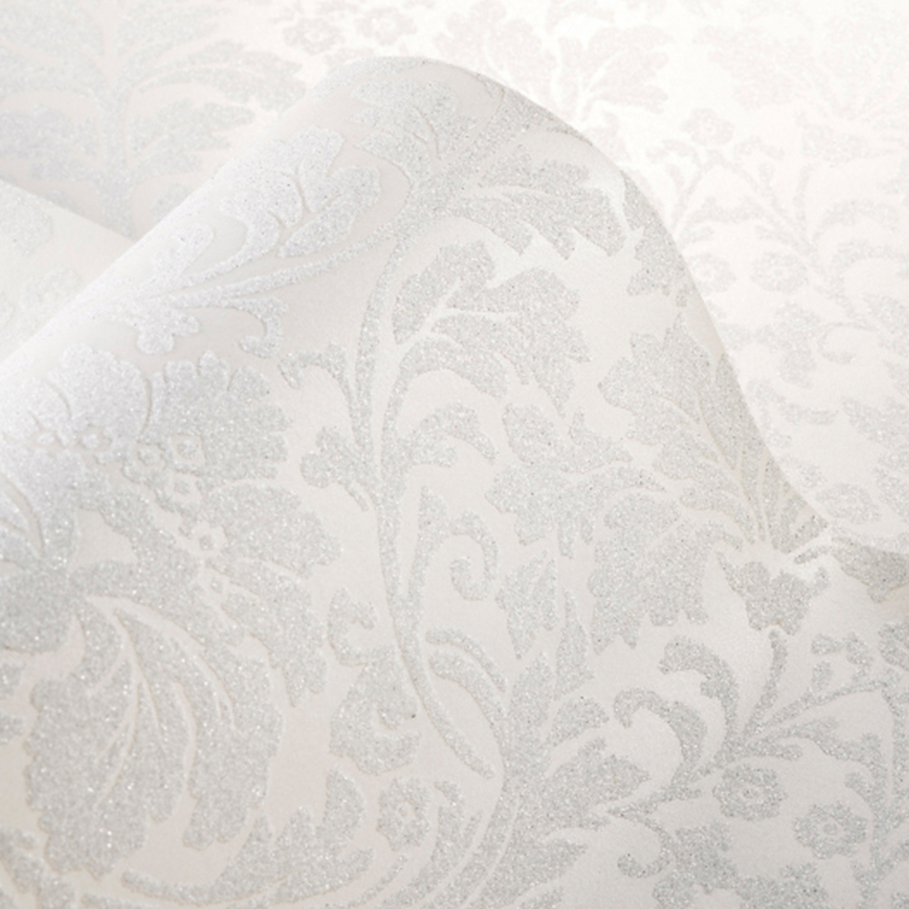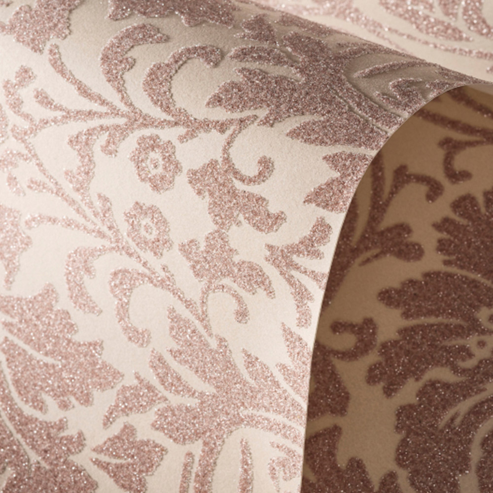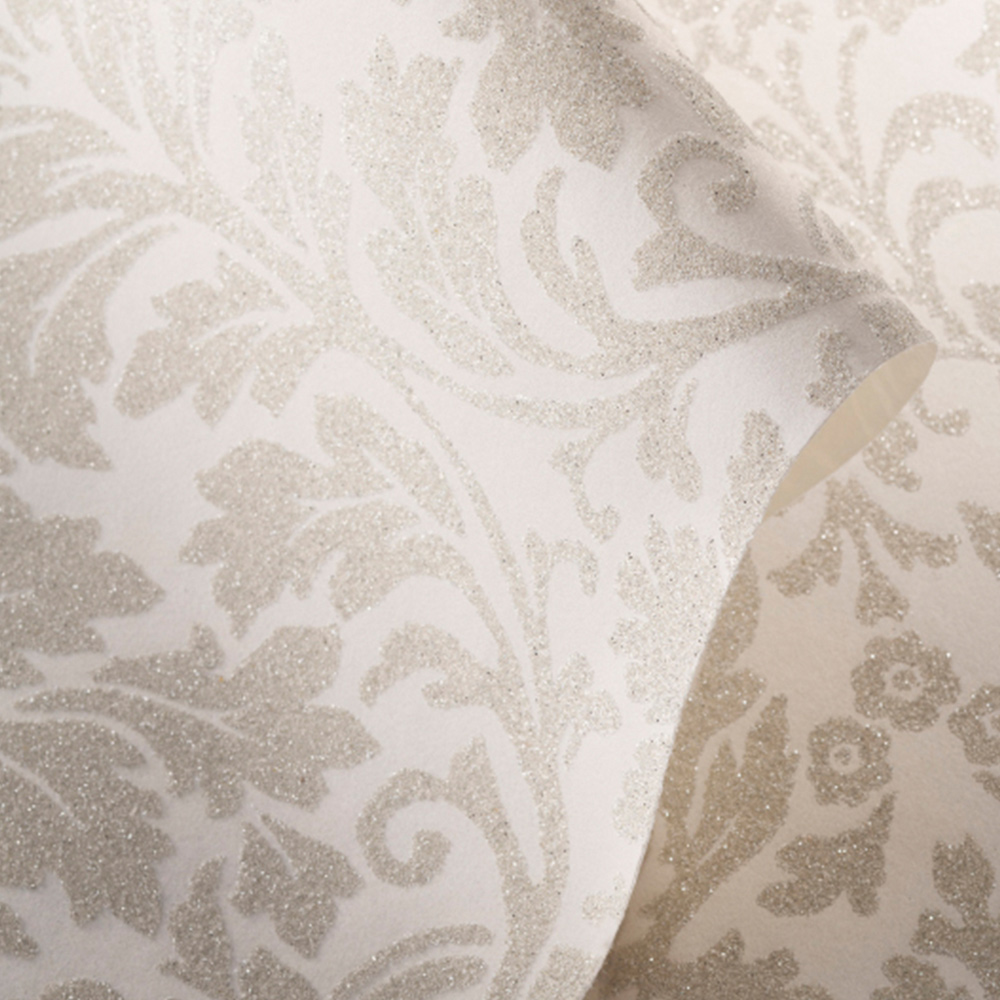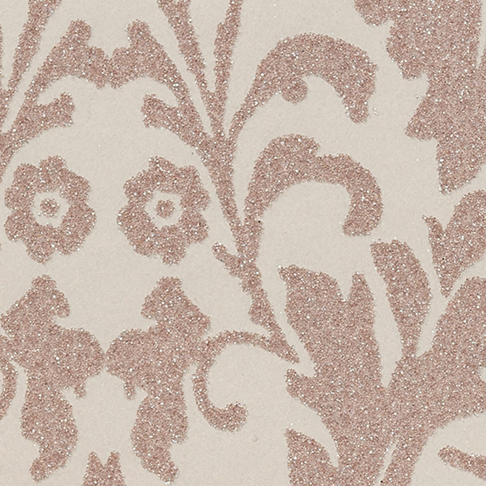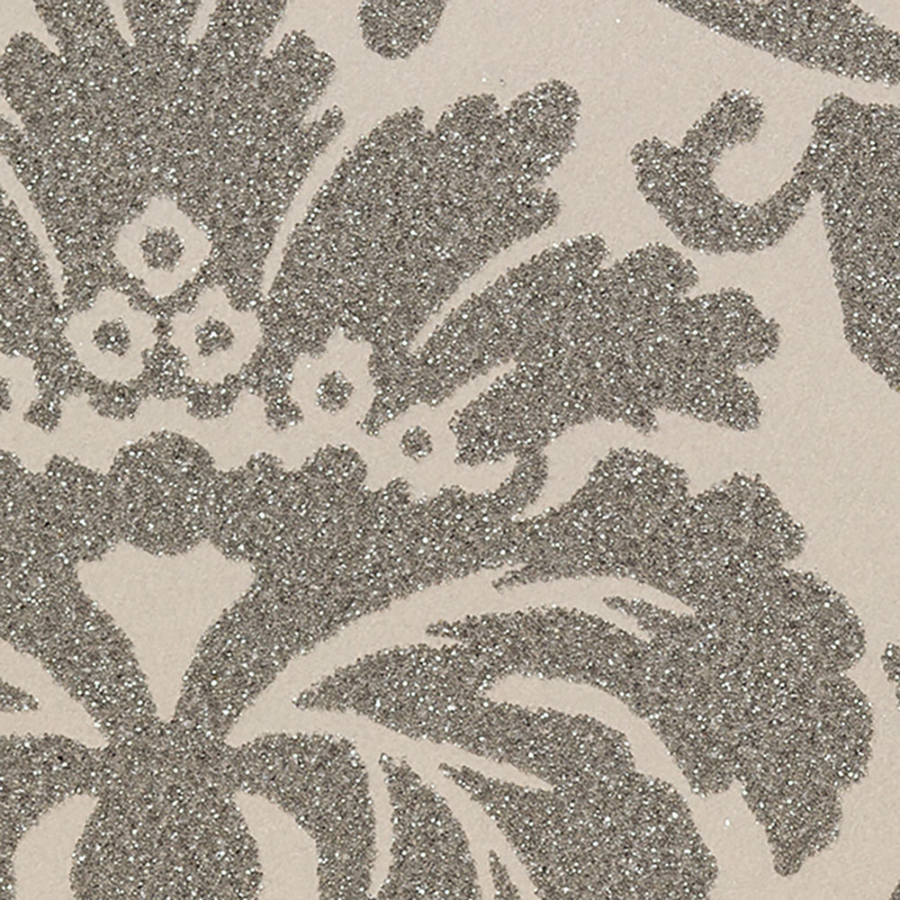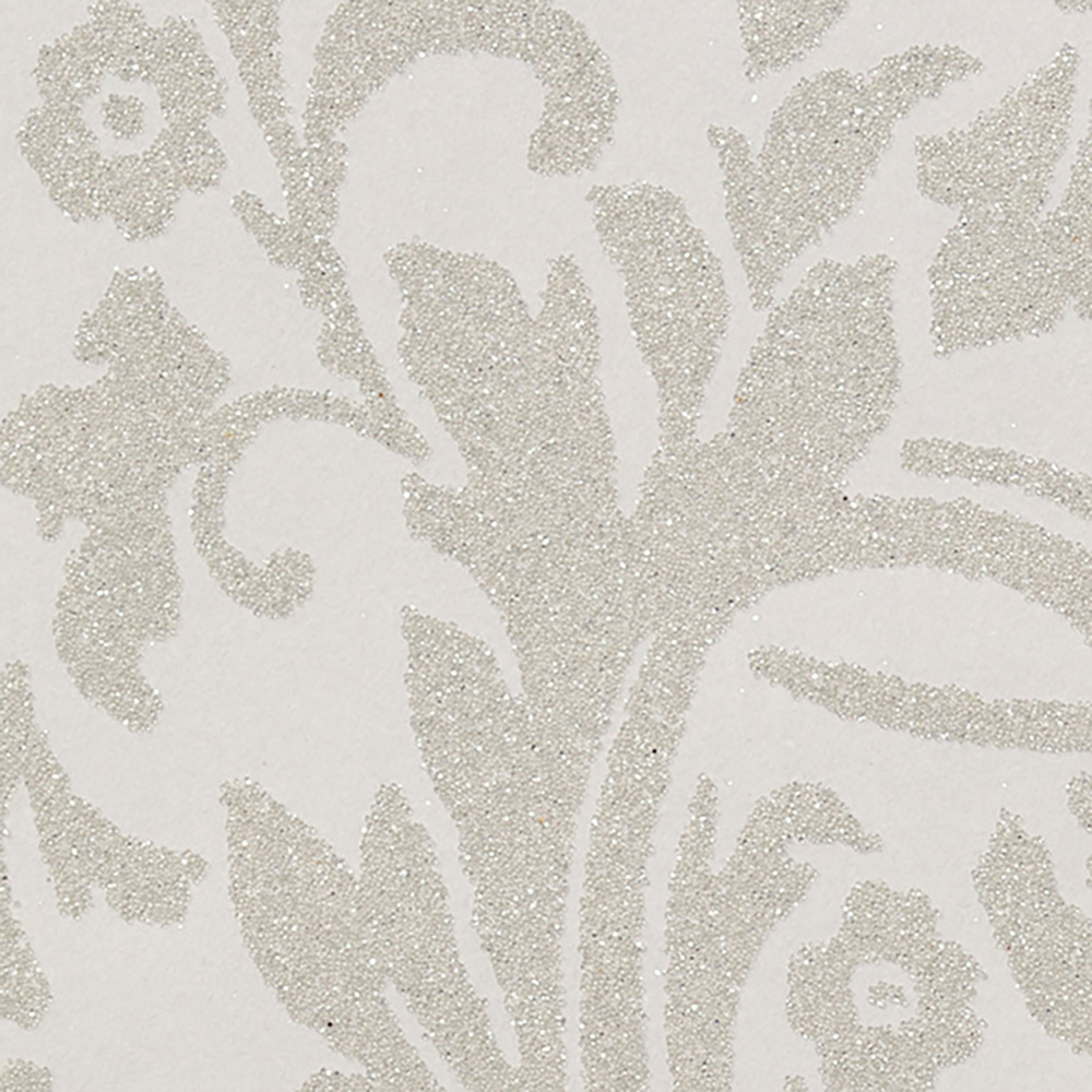 高級感あるダマスク柄にガラスビーズをあしらったラグジュアリーな壁紙です。不燃認定商品ですので、ホテルをはじめとする内装制限がある空間にも安心してお使いいただけます。