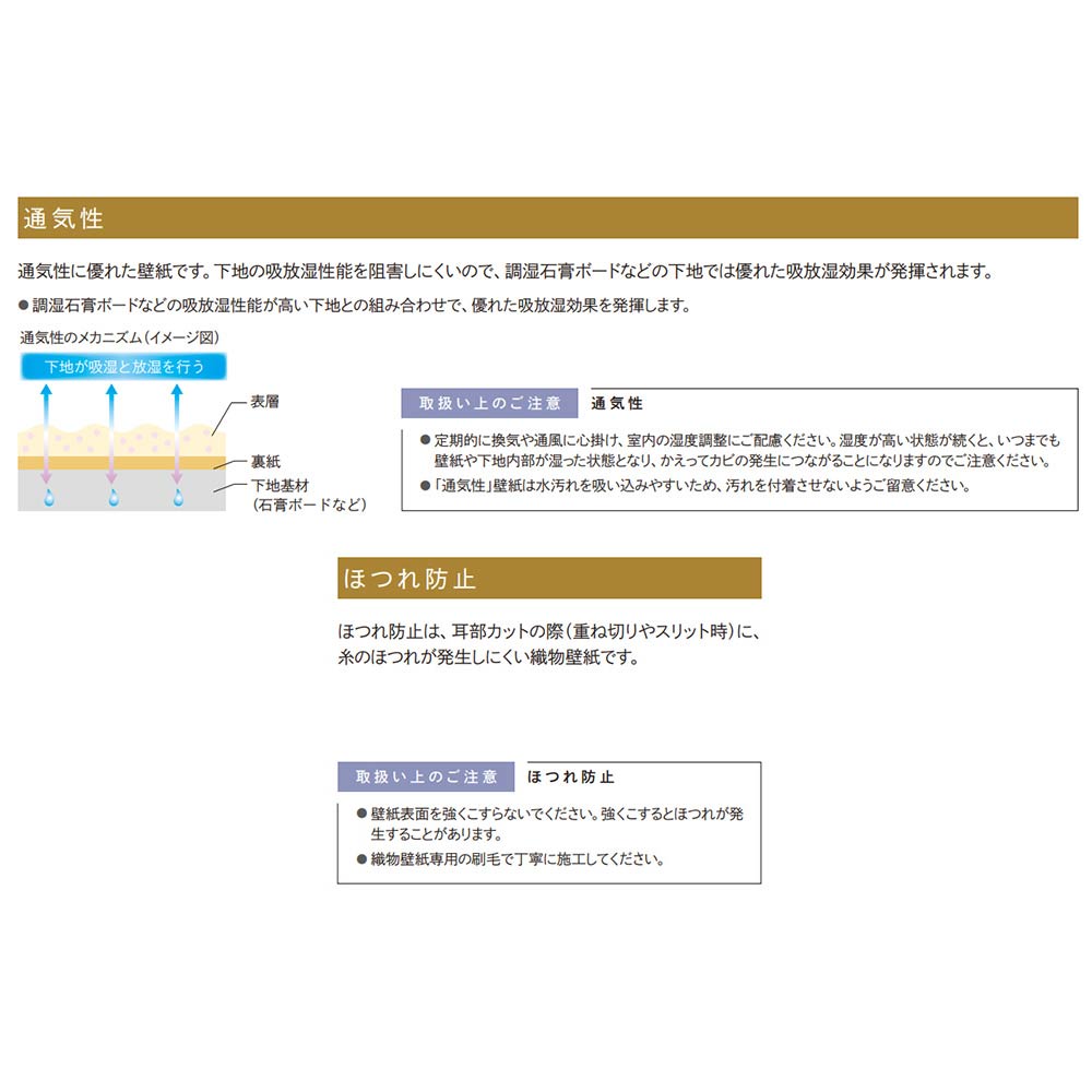 通気性に優れた壁紙です。下地の吸放湿性能を阻害しにくいので、調湿石膏ボードなどの下地では優れた吸放湿効果が発揮されます。