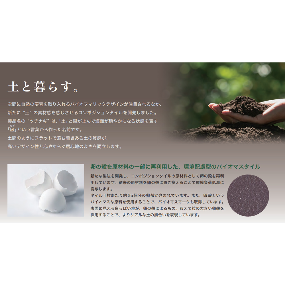 フラットな土の質感を表現。原材料に卵の殻を用いた環境にやさしいバイオマスタイル。