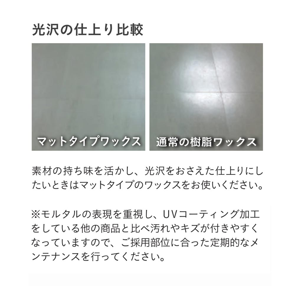 素材の持ち味を活かし、光沢をおさえた仕上りにしたいときはマットタイプのワックスをお使いください。