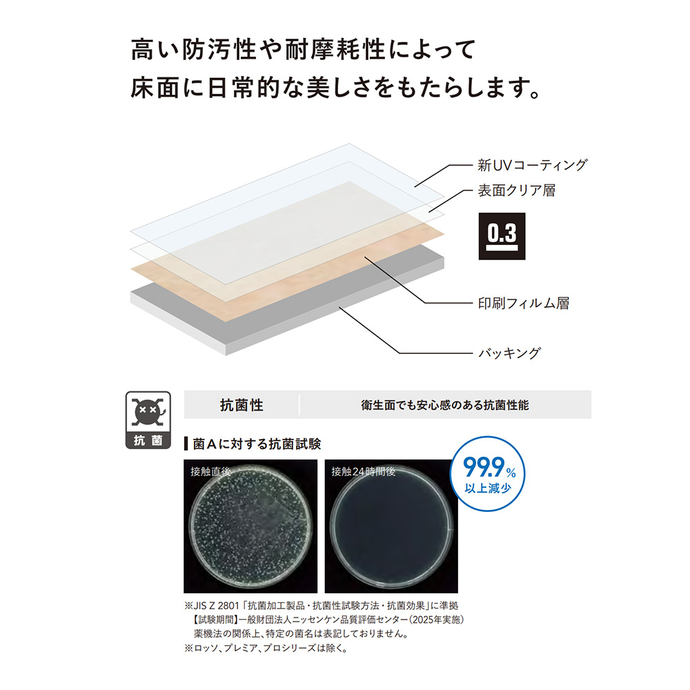 | 機能・特長 | ●機能:NO WAX、抗菌、JIS認証品、グリーン購入法適合、floor score、ビニル床材リサイクル、再生ビニル使用、工場内リサイクル、VOC対策品 ●クリア層:0.1㎜ ●面取り:面取りなし |