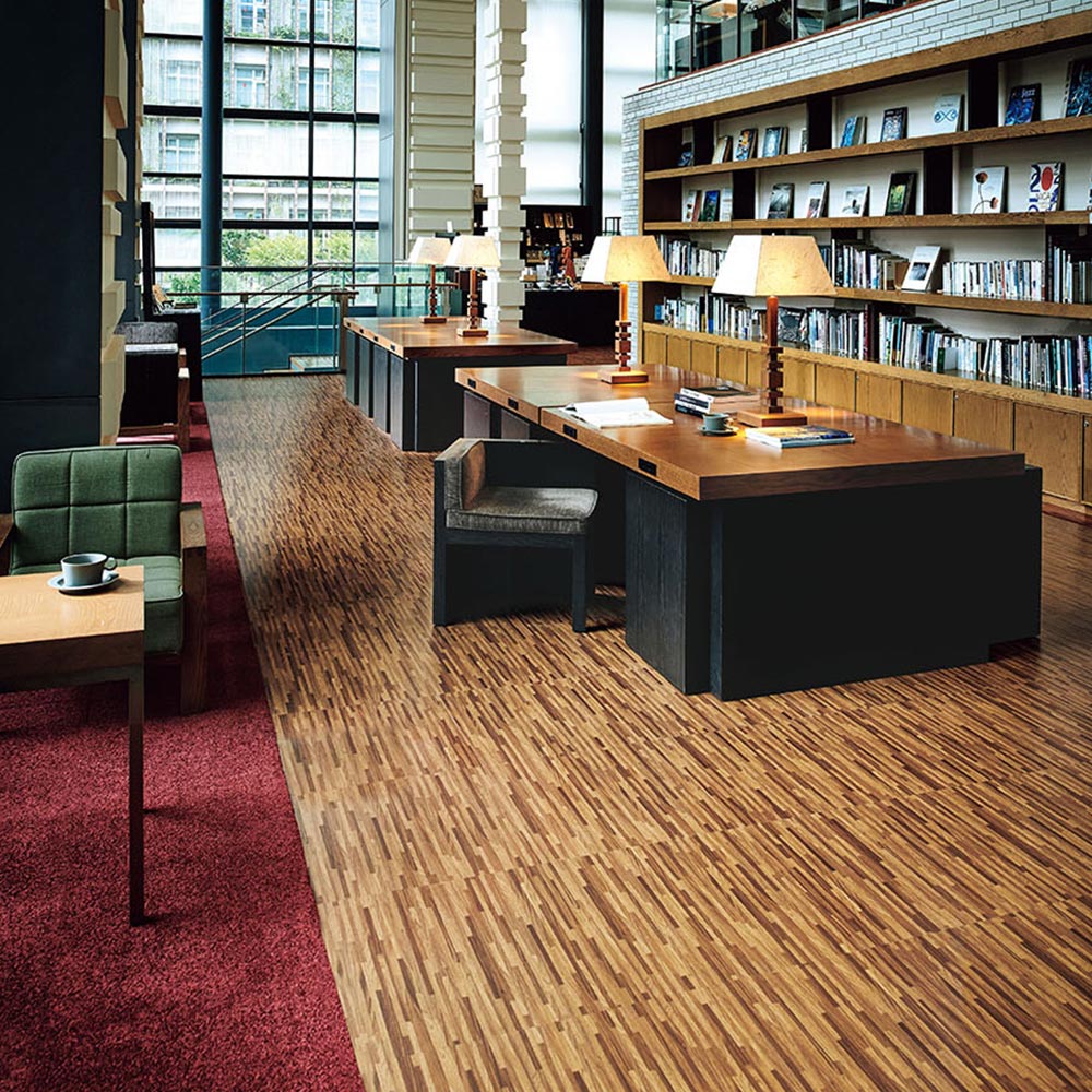 ノーワックスメンテナンス仕様の置敷きビニル床タイル。低光沢で上質感のある仕上がり。