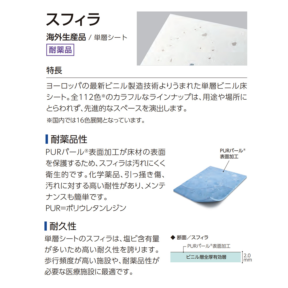 単層シートのスフィラは、塩ビ含有量が多いため高い耐久性を誇ります。歩行頻度が高い施設や、耐薬品性が必要な医療機関に最適です。