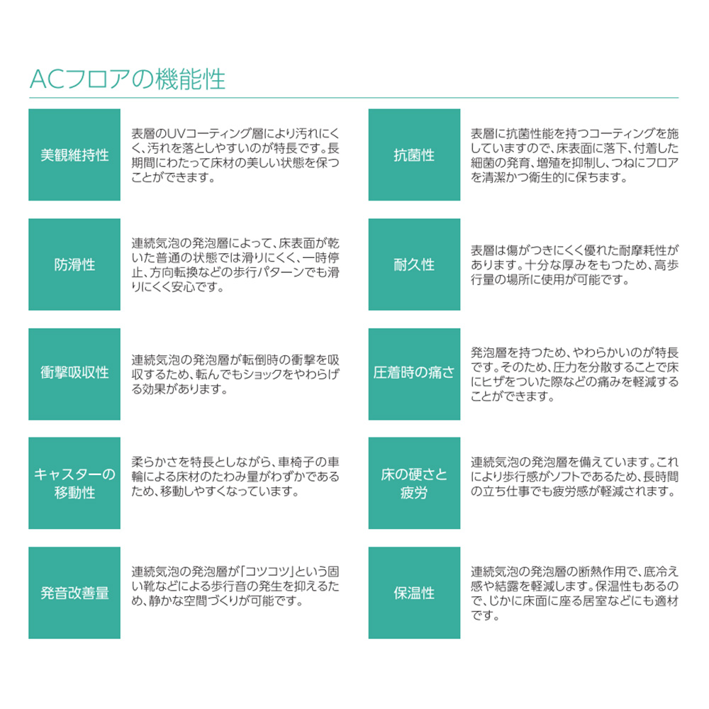 | 機能・特長 | ●機能:抗菌、衝撃吸収、重歩行、JIS認証品、floor score、ビニル床材リサイクル、再生ビニル使用、工場内リサイクル、VOC対策品 |