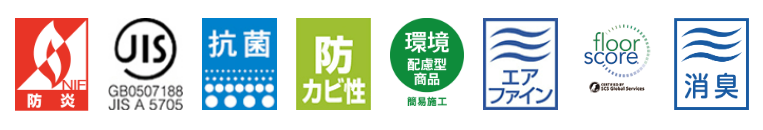 機能・特長 | ●機能:防炎性能試験番号 E2230251、JIS(取得JIS番号 GB0507188・JIS A 5705 ビニル系床材 床シート)、Floor Score、環境配慮型商品(簡易施工)![]() |